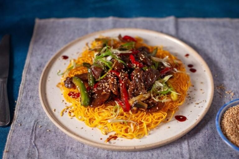 Tender marinated beef stir-fried in a rich black pepper sauce, served over a golden, crispy egg noodle pancake.