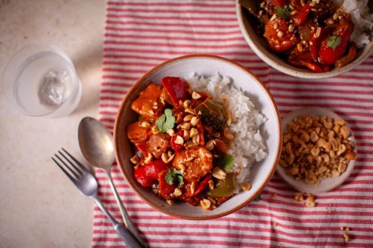 The combination of peanut, curry, and savoury soy sauce creates a rich, nutty sauce that coats every piece of tender chicken.