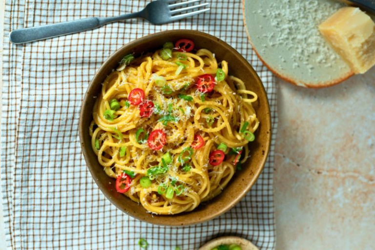 Classic spaghetti is tossed with fragrant garlic butter and oyster sauce, creating a glossy, umami-rich coating, then finished with parmesan for extra depth.