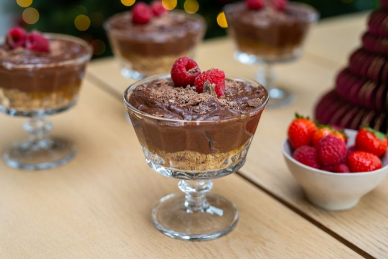 Featured on Eva Pau’s Asian Christmas, this dessert brings together classic chocolate mousse with unexpected Asian-inspired flavours. The soy caramel adds balance to the richness of the chocolate, while the biscuit crumb introduces warmth, texture, and a slight aromatic spice. Served in individual glasses and finished with raspberries and chocolate flakes, it makes an elegant festive dessert that feels both comforting and modern.
